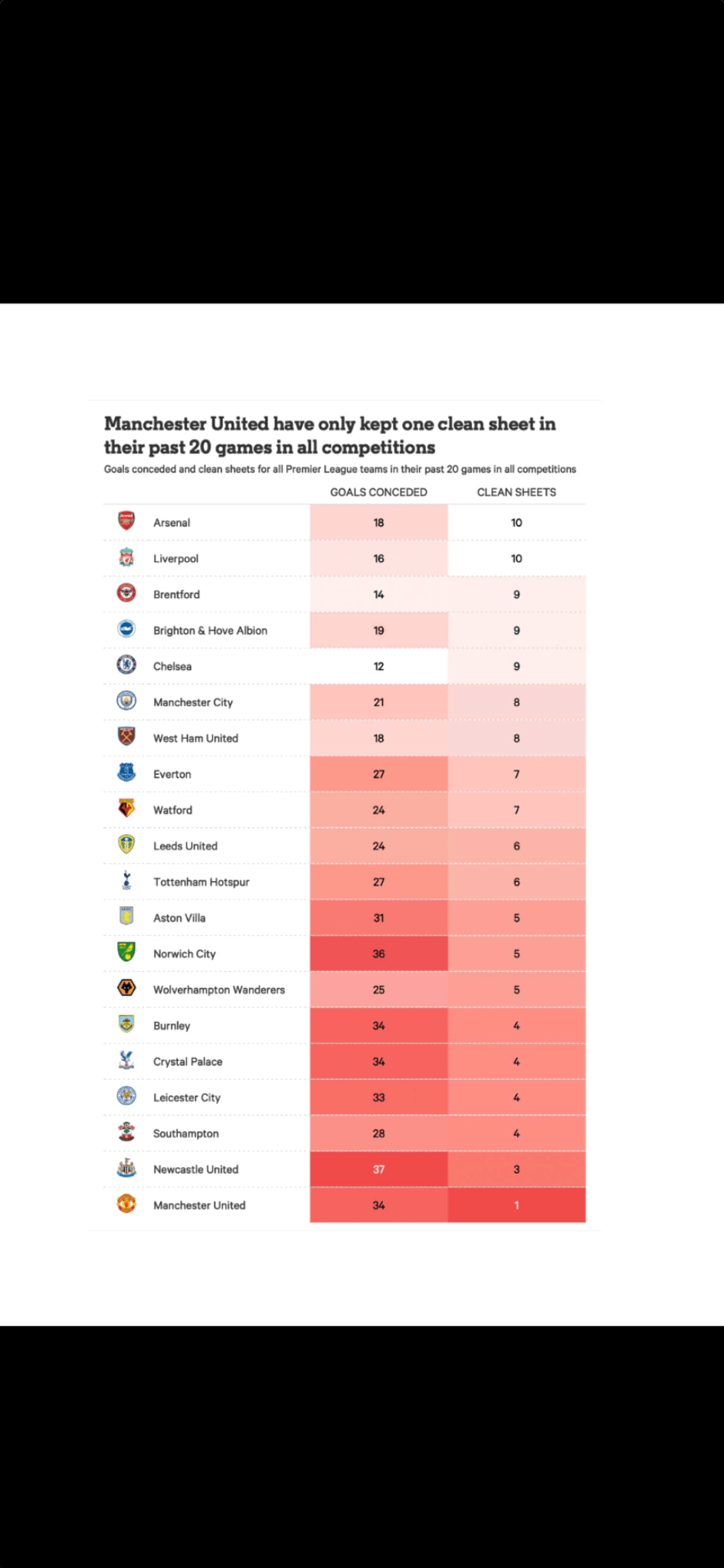 Shockingly, that record of 34 against – with just one clean sheet recorded – in the past 20 games, puts them dead last among Premier League competitors.