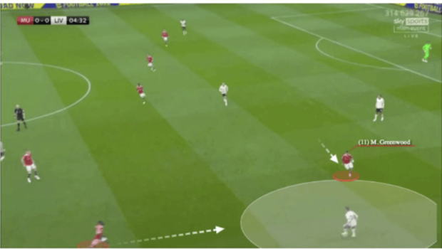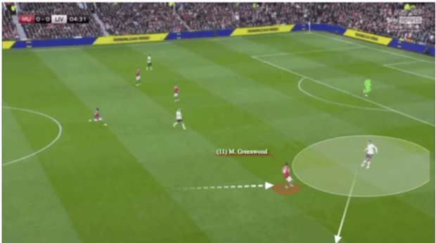 First Mason Greenwood runs towards ‘Pool centre-back Virgil Van Dyke without cutting off the passing lanes: