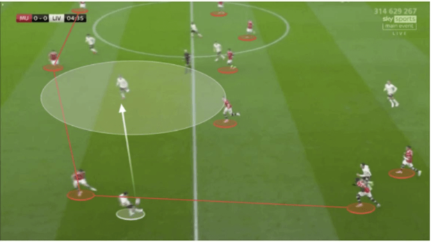 With Wan-Bissaka caught in no man’s land, Victor Lindelof is pulled out of position to cover the right side. The midfield is too advanced, so an easy pass inside finds Roberto Firmino in acres of space.