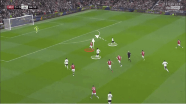 A simple ball to Mohammed Salah – played onside by Luke Shaw – leaves the United left-back in serious trouble. United’s midfield cannot get back quickly enough to offer any protection.