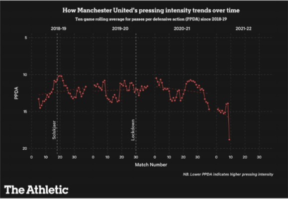 Looking at the Red Devils’ pressing over a ten-game spell shows that the intensity has been plummeting since the final third of last season.