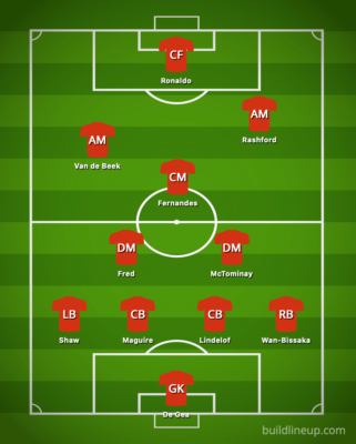 This would lead to a rather unbalanced 4-2-1-2-1 formation, with Rashford and Fernandes having to provide some width behind Ronaldo. Fred and Van de Beek would also be expected to make forward runs with McTominay a more static pivot.
