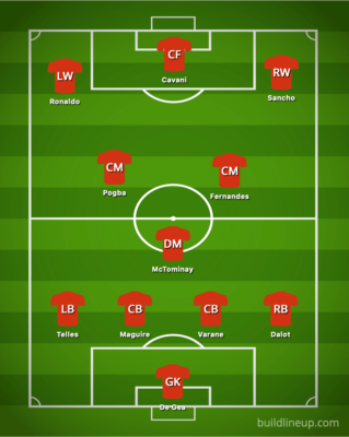 Edinson Cavani could be brought back in, but this leaves the issue of who makes way. Of the Rashford – Ronaldo – Sancho front three against Boro, Sancho was the best performer and should keep his place. Ronaldo could be retained as a wide forward or could be rested, with Rashford, Anthony Elanga or even Jesse Lingard taking one of the wing positions.