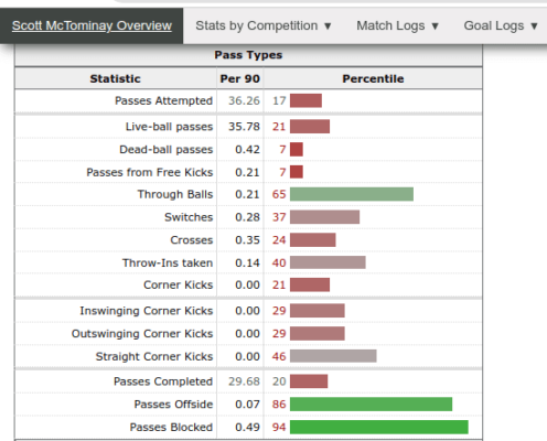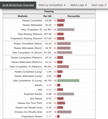 McTominay averaged only 16.43 short passes and 1.94 long passes last season. This put him in the 36th and 14th percentile respectively.