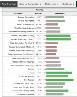 Fred averaged a healthy 24.22 short passes and almost twice as many long balls per 90 as McTominay. In these metrics, he slotted in at the 80th and 43rd percentile respectively. Fred also managed 1.93 key passes per game in the last campaign.