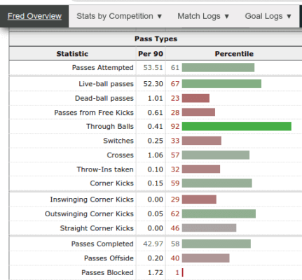 Fred delivered 0.41 through balls per appearance which put him in the 92nd percentile among Premier League central men. McTominay only averaged 0.21 in the same category.